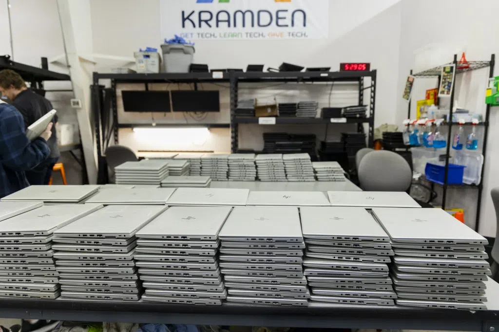 A stack of computers waits to be cleaned and sorted for donation at the Kramden Institute in Durham, N.C. on Wednesday, March 27, 2024. (Photo credit: Alexandria deRosset/ UNC Media Hub)